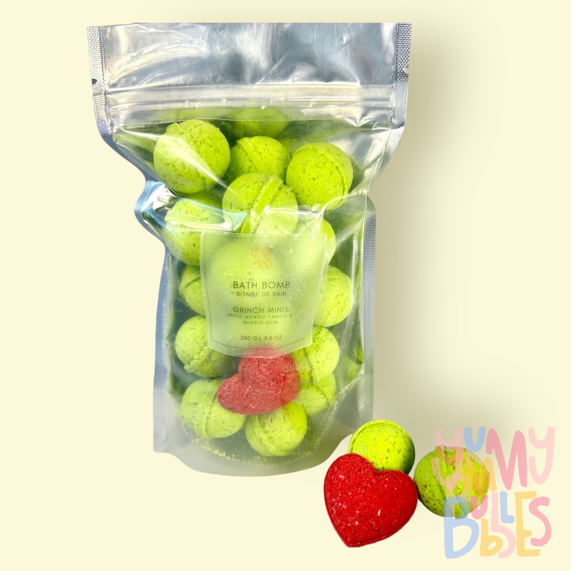 Directions: Grinch Gumballs are scented with Apple Mango Tango and contain a red heart scented Fresh Strawberry. Drop one in a bath for a little fizz and colour.